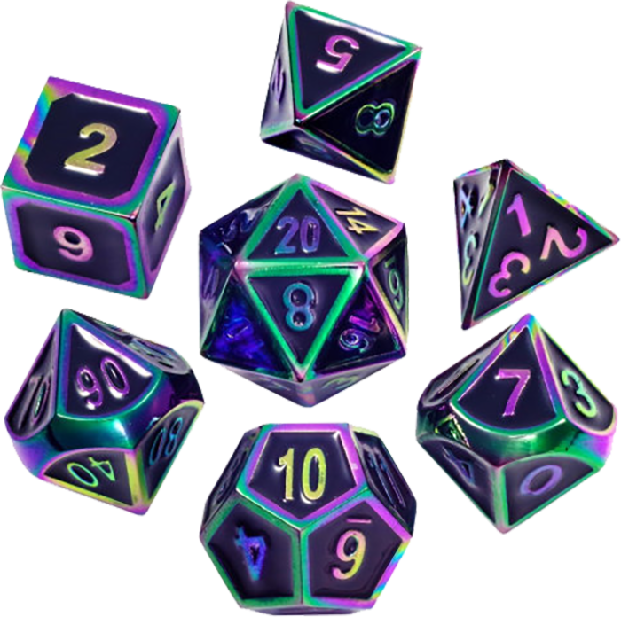 Набор из 7 кубиков: d4, d6, d8, d10, d12, d20 и d%.