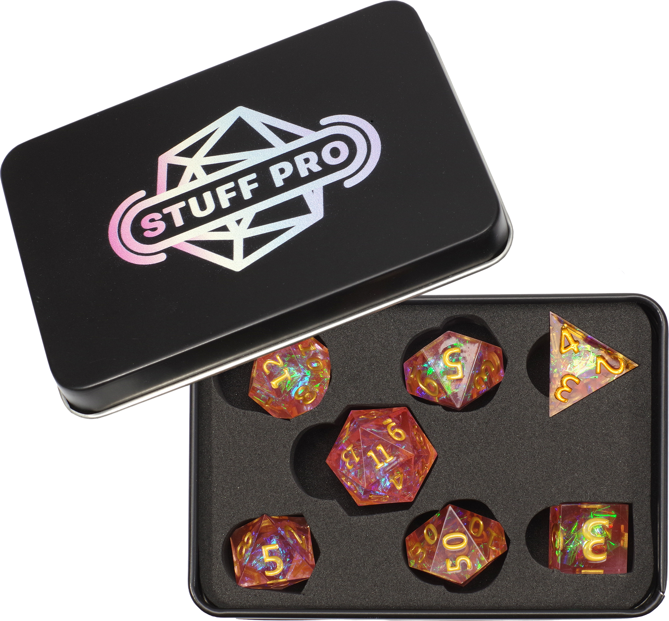 Набор из 7 кубиков: d4, d6, d8, d10, d12, d20 и d%.