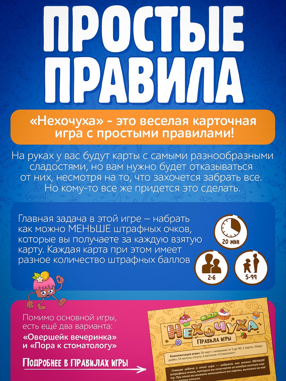 На руках у вас будут карты с самыми разнообразными сладостями. Но не спешите потирать руки! От них нужно отказываться, чтобы не получить больше вех штрафных очков!