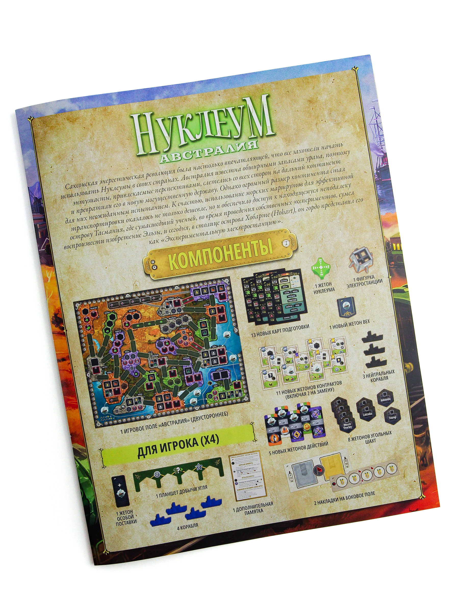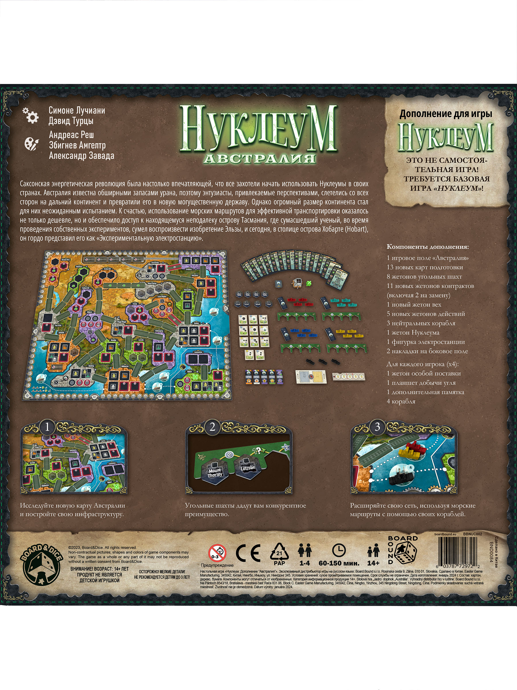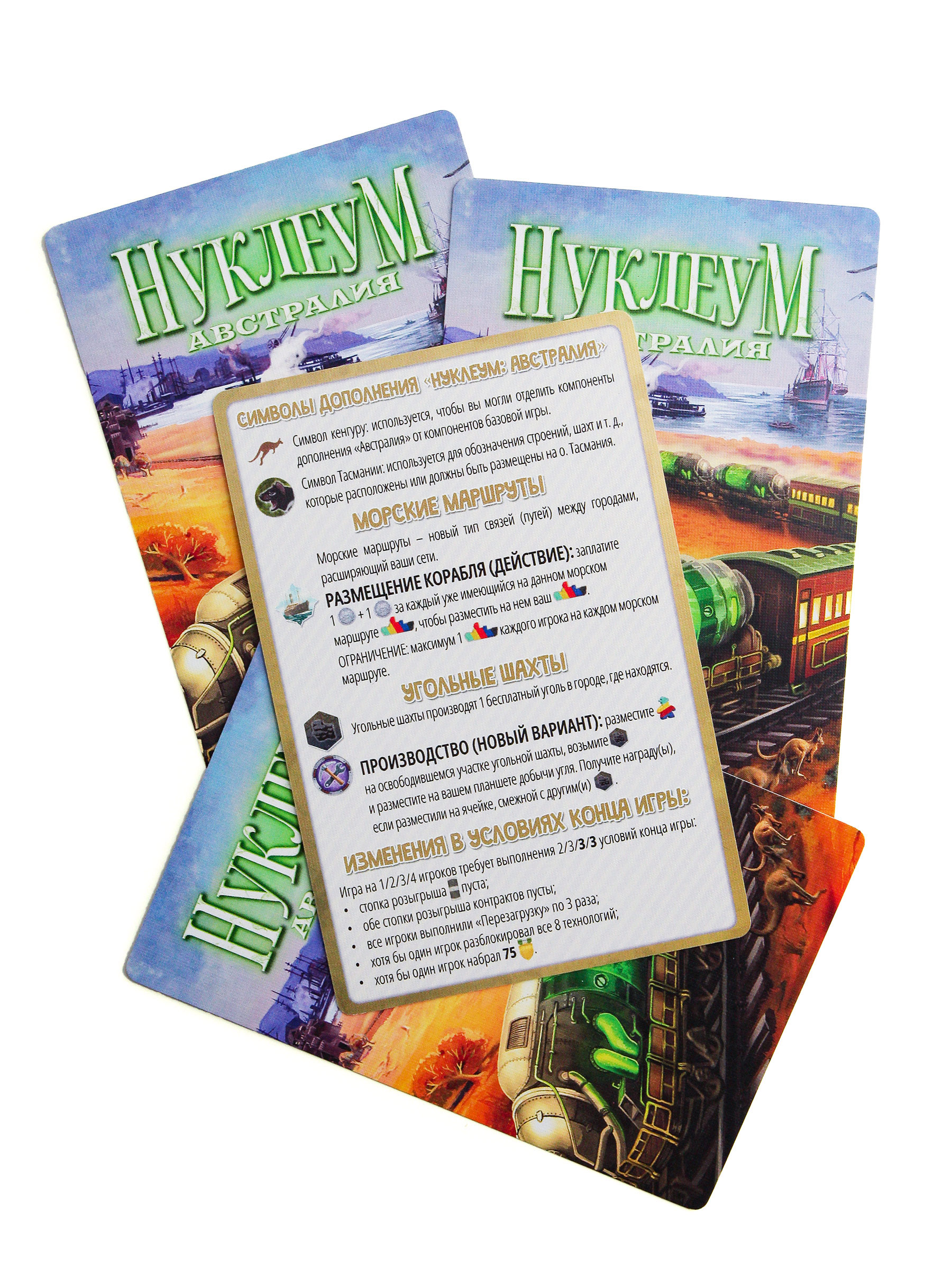 Нуклеум. Австралия поставляется с новой картой, которая представляет несколько новых концепций и изменений в правилах базовой игры. Используйте морские пути, чтобы расширить свои сети, построить собственные угольные шахты и попробуйте экспертный вариант с торгами.