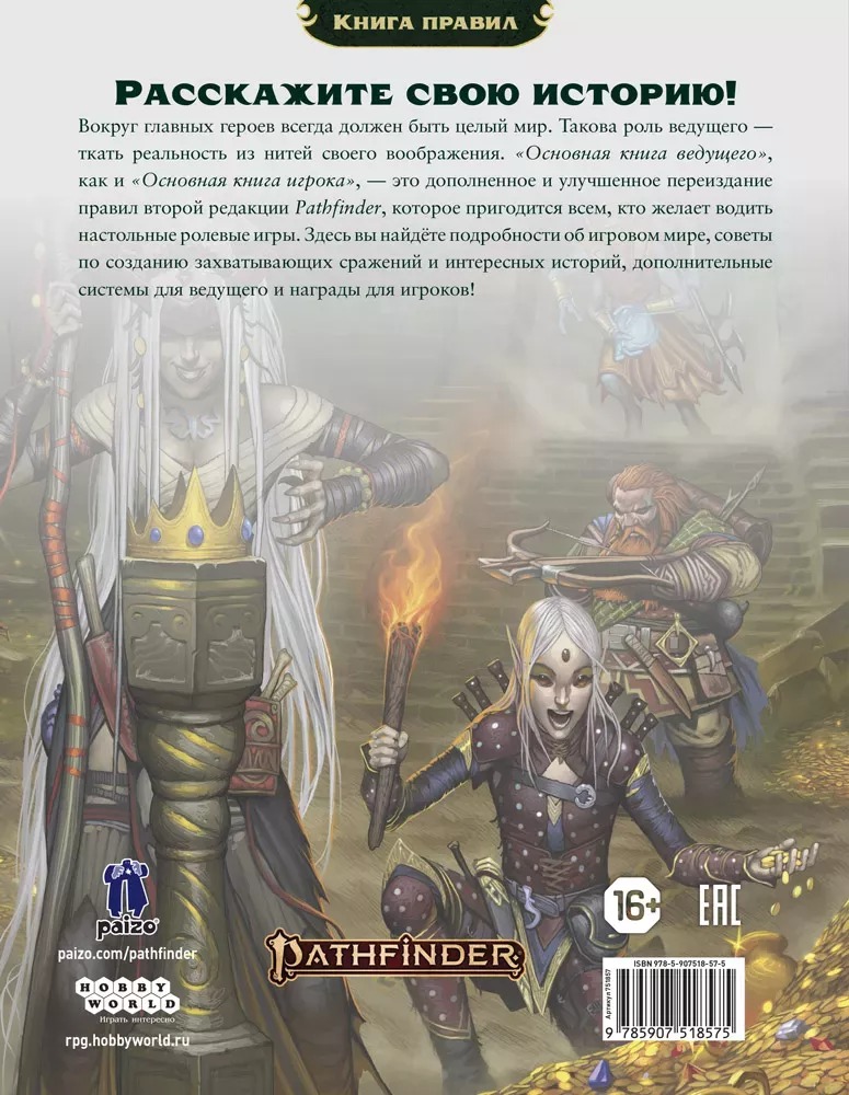 "Основная книга ведущего" призвана сопровождать отважного творца на его увлекательном пути. В ней содержится информация об игровом мире, которая позволит вам раскрыть своего внутреннего гения – придумать множество увлекательных боевых ситуаций для игроков, сочинить уйму захватывающих историй и создать персонажей, которые оживят игровое пространство. Разумеется, есть в ней и более практические данные – дополнительные системы и потенциальные награды, которыми вы можете одарить своих подопечных путешественников. Основанная на правилах второй редакции, "Основная книга ведущего" является лучшим справочником для каждого, кто загорелся желанием водить настольные ролевые игры и создавать свои вселенные.