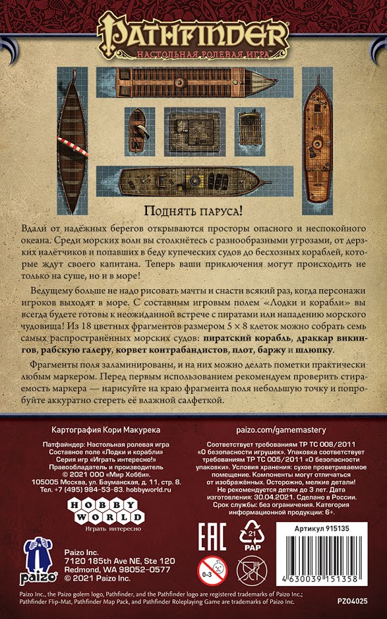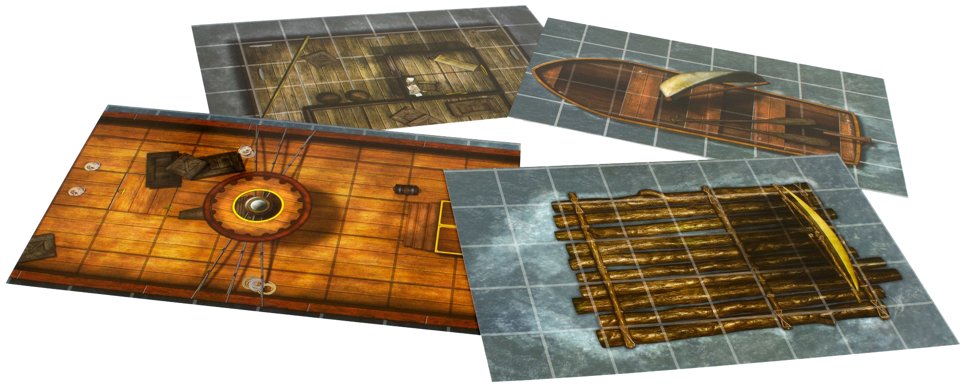 Ведущему больше не надо рисовать мачты и снасти всякий раз, когда персонажи игроков выходят в море. С составным игровым полем «Лодки и корабли» вы всегда будете готовы к неожиданной встрече с пиратами или нападению морского чудовища! Из 18 цветных фрагментов размером 5 × 8 клеток можно собрать семь самых распространённых морских судов: пиратский корабль, драккар викингов, рабскую галеру, корвет контрабандистов, плот, баржу и шлюпку.