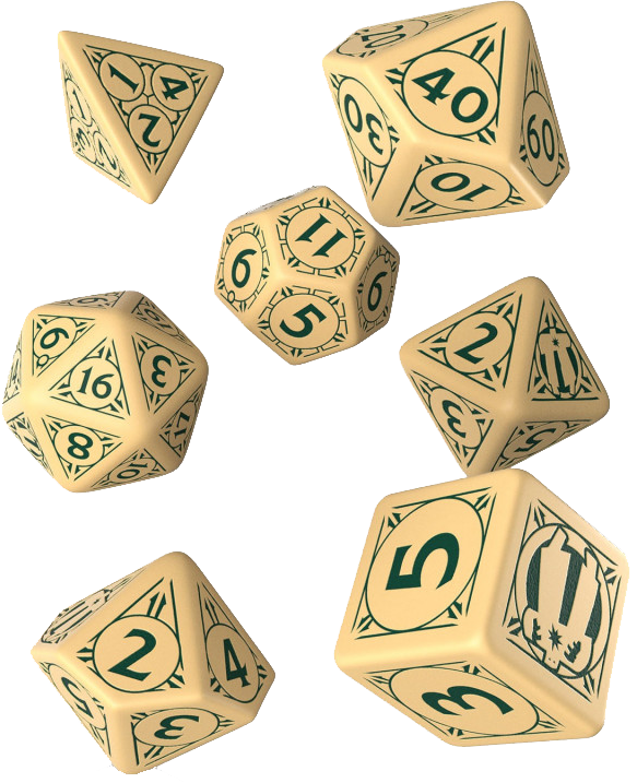 Набор из 7 кубиков: d4, d6, d8, d10, d12, d20 и d%.