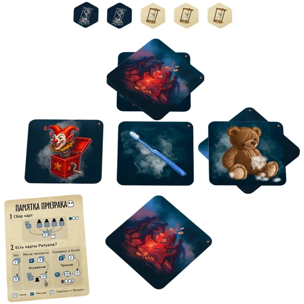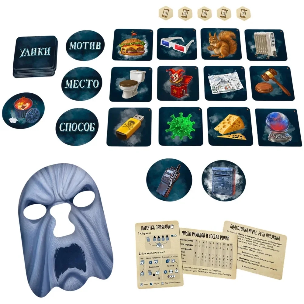 В игре вы как настоящие сыщики расследуете загадочное убийство – осматриваете место преступления, ищете улики и собираете все детали в общую картину, чтобы определить мотив, место и и способ. Один игрок становится Призраком – жертвой, лишённой голоса. Другие – Детективами, пытающимися распутать дело. Улик в игре много, и не каждая может оказаться полезной. Детективы передают Призраку карты улик, а Призрак выбирает, какие из них открыть в качестве подсказок, а какие – скрыть. Безмолвный Призрак не может дать Детективам точного ответа, а лишь направлять их обрывочными намёками. Вам предстоит понять, что из полученной информации – важная деталь, а что – след запутывающего вас убийцы. Будьте внимательны и отыщите три верные улики, прежде чем тьма снова сомкнётся вокруг вас!
