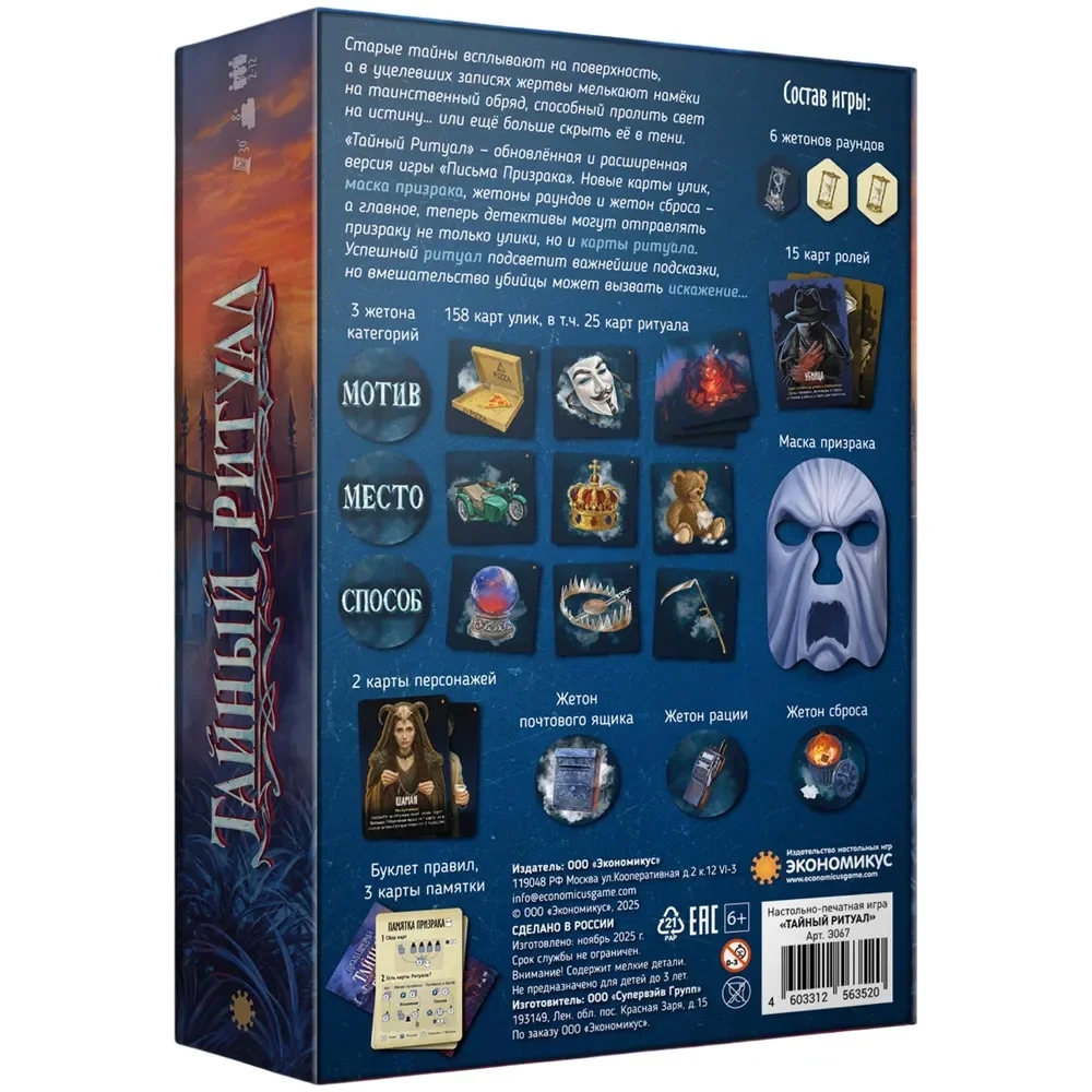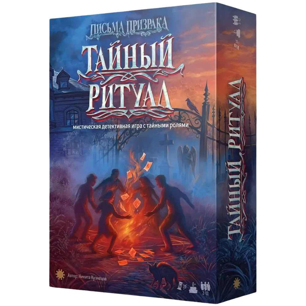 "Тайный Ритуал" – обновлённая и дополненная версия игры "Письма Призрака". Теперь в расследовании появляются не только новые улики, жетоны и маска призрака, но и особые карты ритуала, которые детективы могут посылать призраку. Если обряд пройдёт как надо, детективам откроются важные подсказки. Однако убийца может вмешаться в ритуал и исказить знаки, и тогда тьма станет ещё глубже.