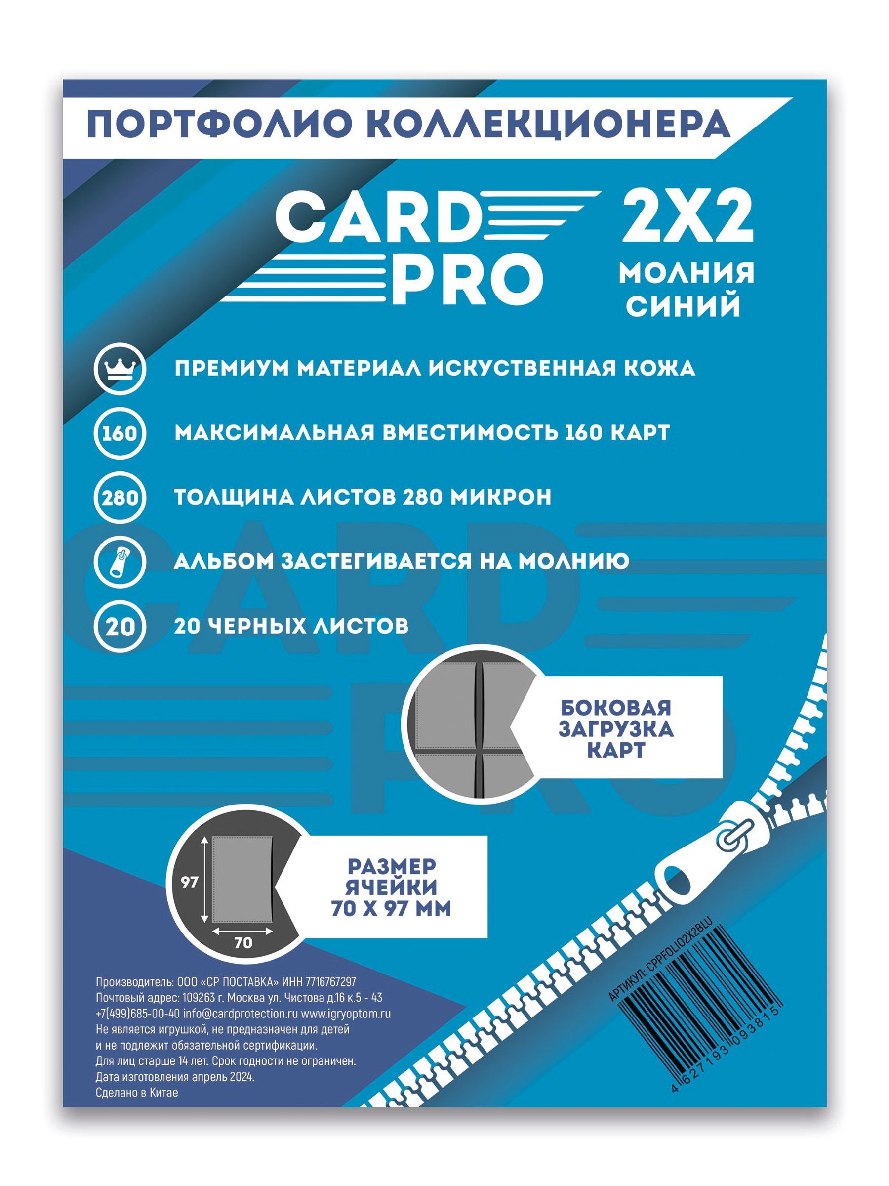 Премиум альбом Card-Pro с 20 встроенными листами 2х2 - Синий (на молнии)