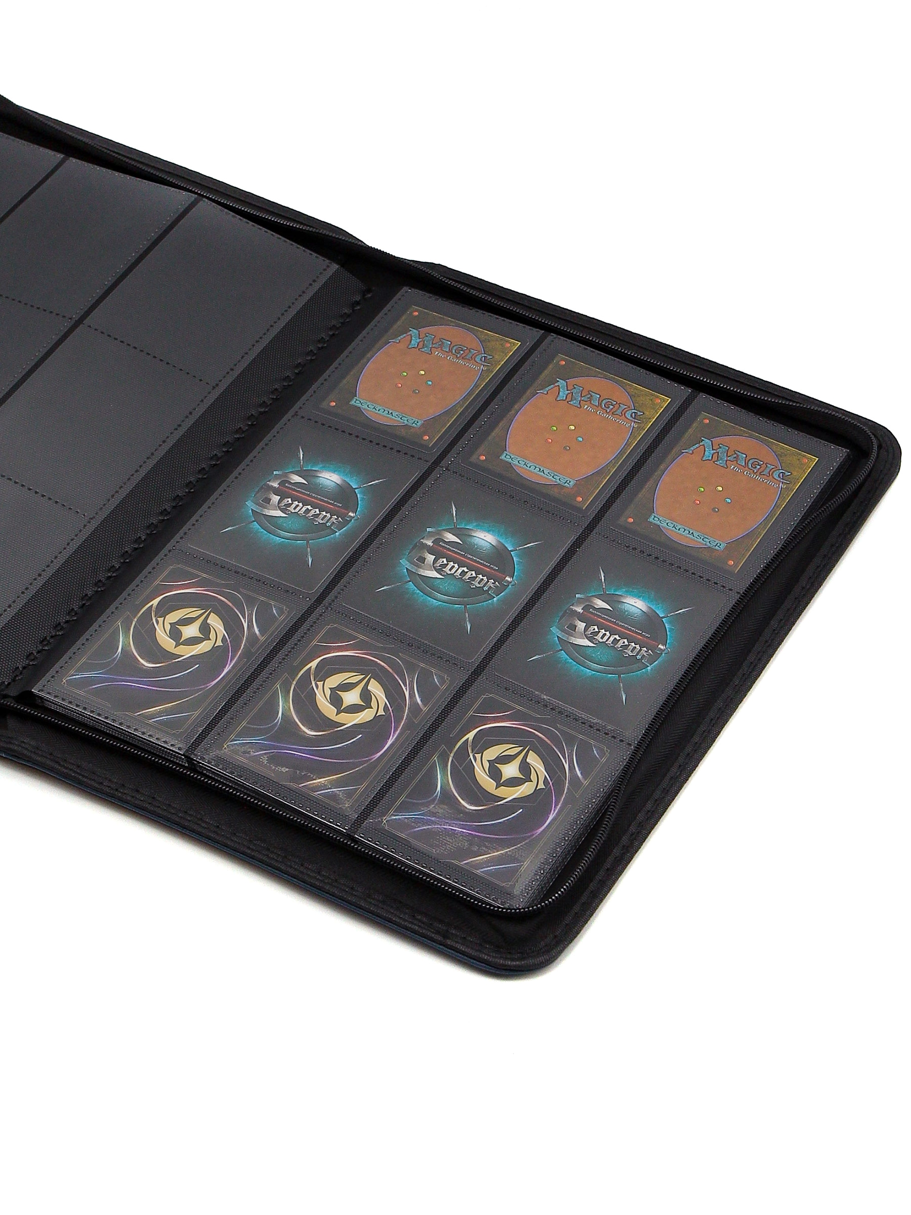Премиум материал искусственная кожа. Содержит 20 двусторонних листов, что позволяет хранить в нём до 360 карт. Размер альбома - 35х25 см. Размер кармашков для карт - 68х96 мм. Боковая загрузка карт. Толщина листов - 280 микрон. Застегивается на молнию.