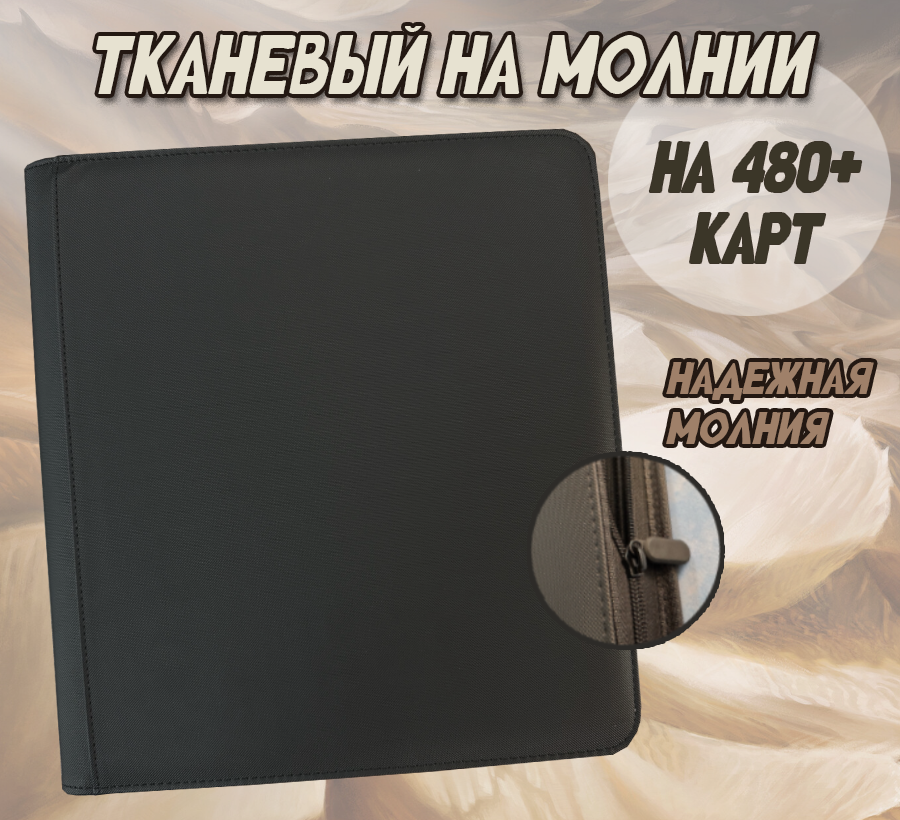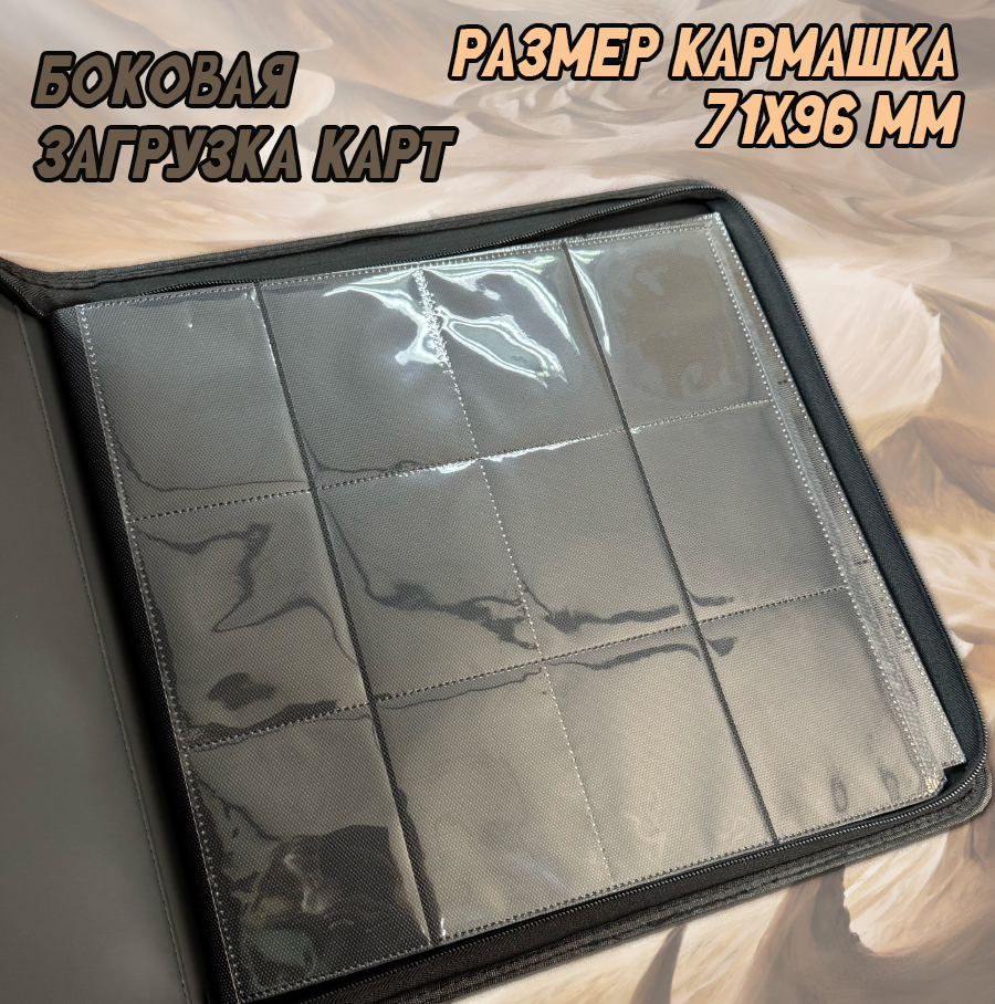 Альбом 3х4 для коллекционирования с 20 встроенными черными листами боковой загрузки. Обложка альбома тканевая, плотная. Альбом закрывается на молнию, благодаря чему карты точно не потеряются.