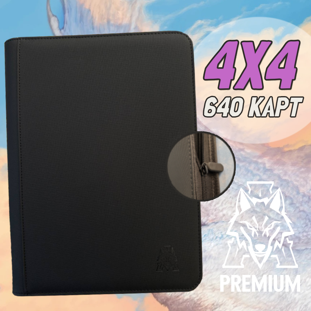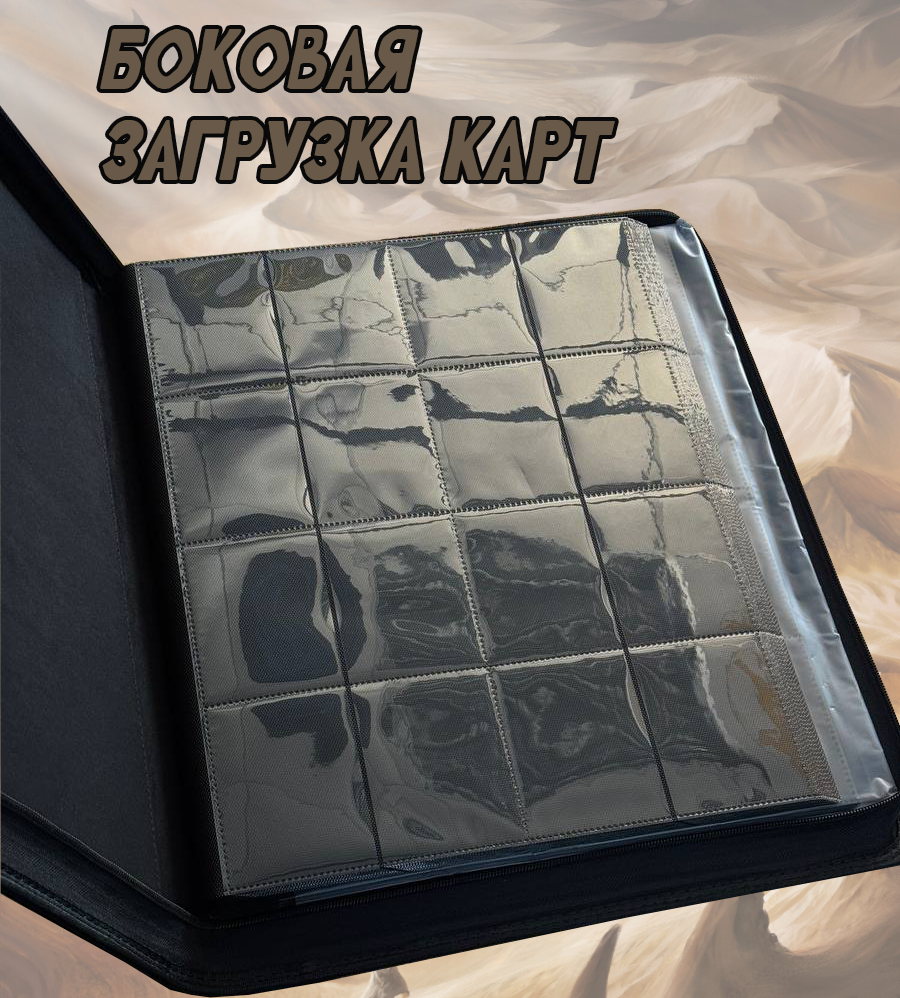 Альбом 4х4 для коллекционирования с 20 встроенными черными листами боковой загрузки. Обложка альбома тканевая, плотная. Альбом закрывается на молнию, благодаря чему карты точно не потеряются.