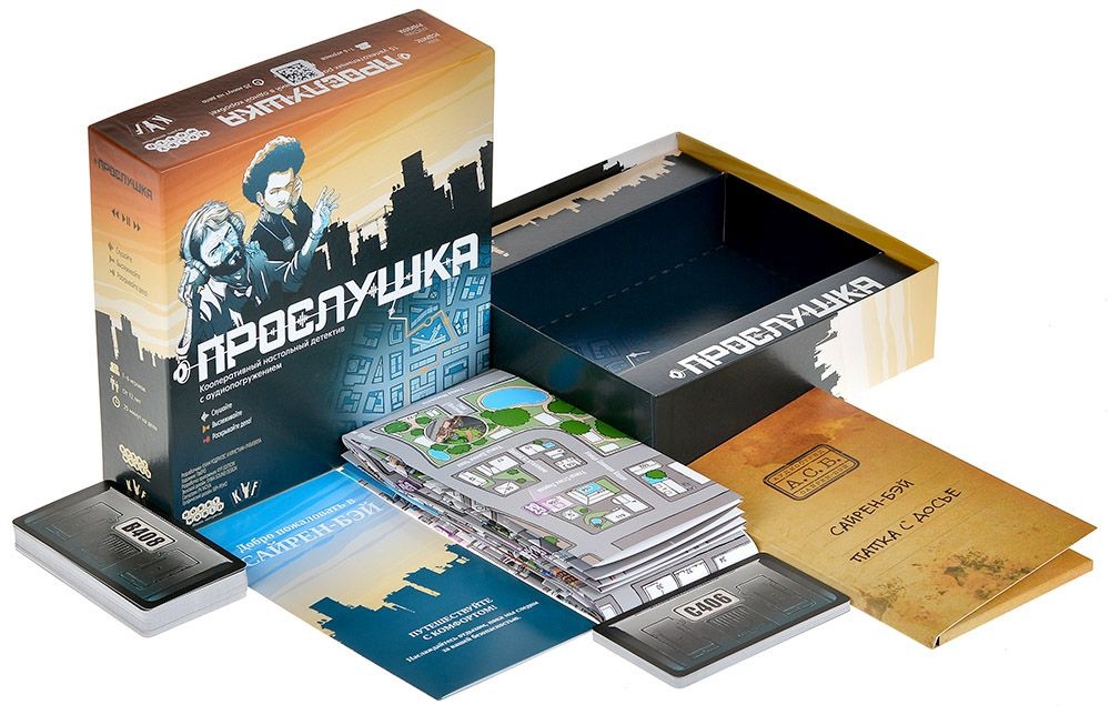 "Прослушка" – это кооперативный настольный детектив, в котором вы и ваши друзья станете следователями особого аудиоотряда. Совместными усилиями вам предстоит провести 15 уникальных расследований, входящих в данную коробку, чтобы вычислить преступников. Но вы сможете раскрывать преступления и в одиночку, если ваши напарники уехали в офис и оставили в отделе одного.
