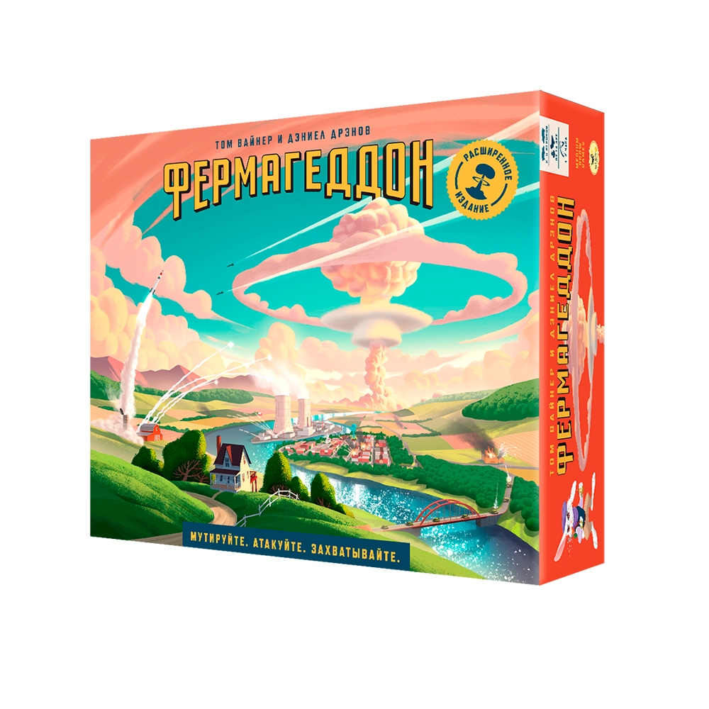 Данное расширение добавляет к базовой игре компоненты для пятого игрока (встречайте кроликов!) и ещё больше веселья и ядерных боеголовок. А ещё внутри новые карты мутаций и шпионов, деревянные жетоны на замену картонным, металлическая монета, картонная коробочка для хранения карт в протекторах и мешочек для кубиков.