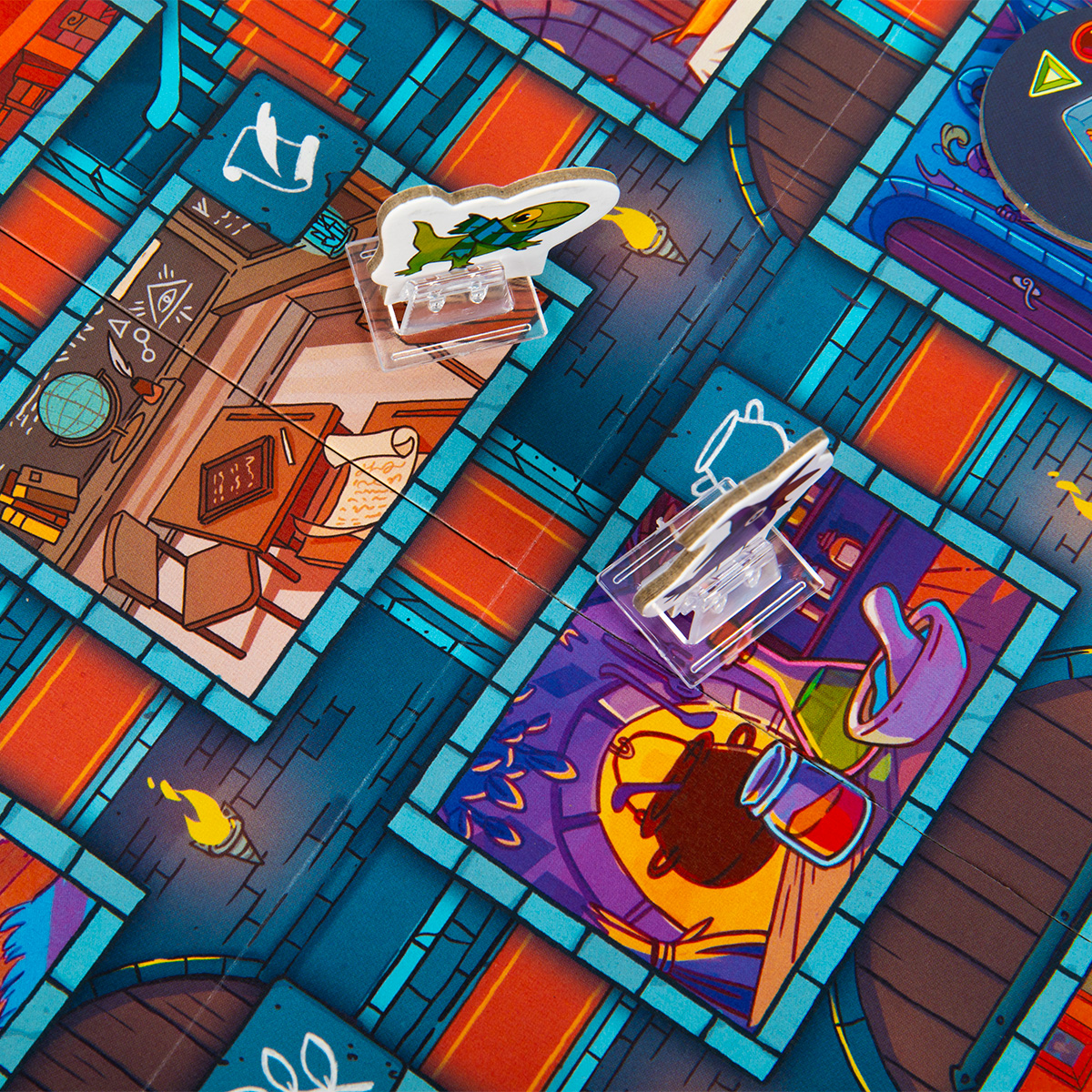 1) Игрок передвигает фигурку 1 любого фамильяра в любую соседнюю комнату, соблюдая правила передвижения.