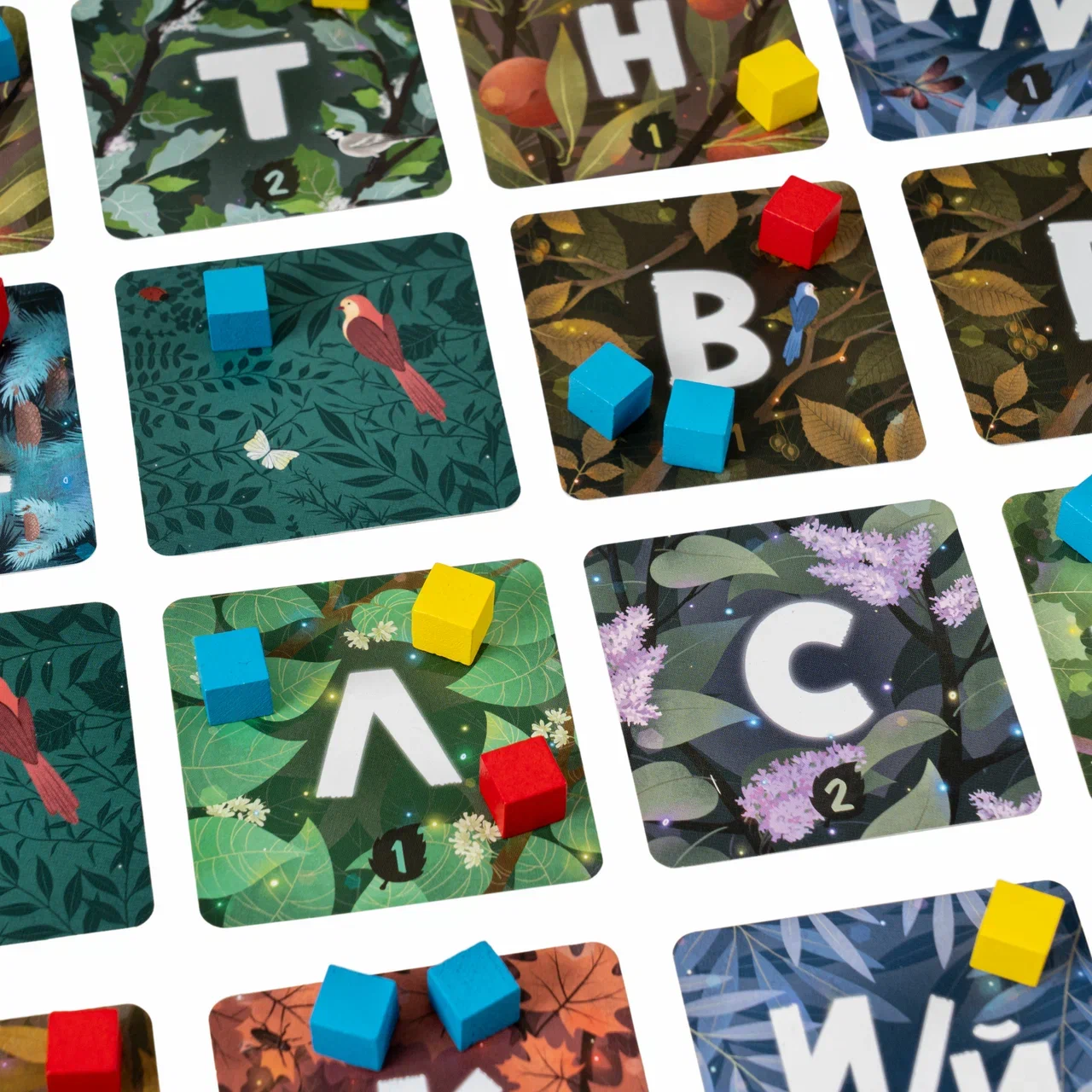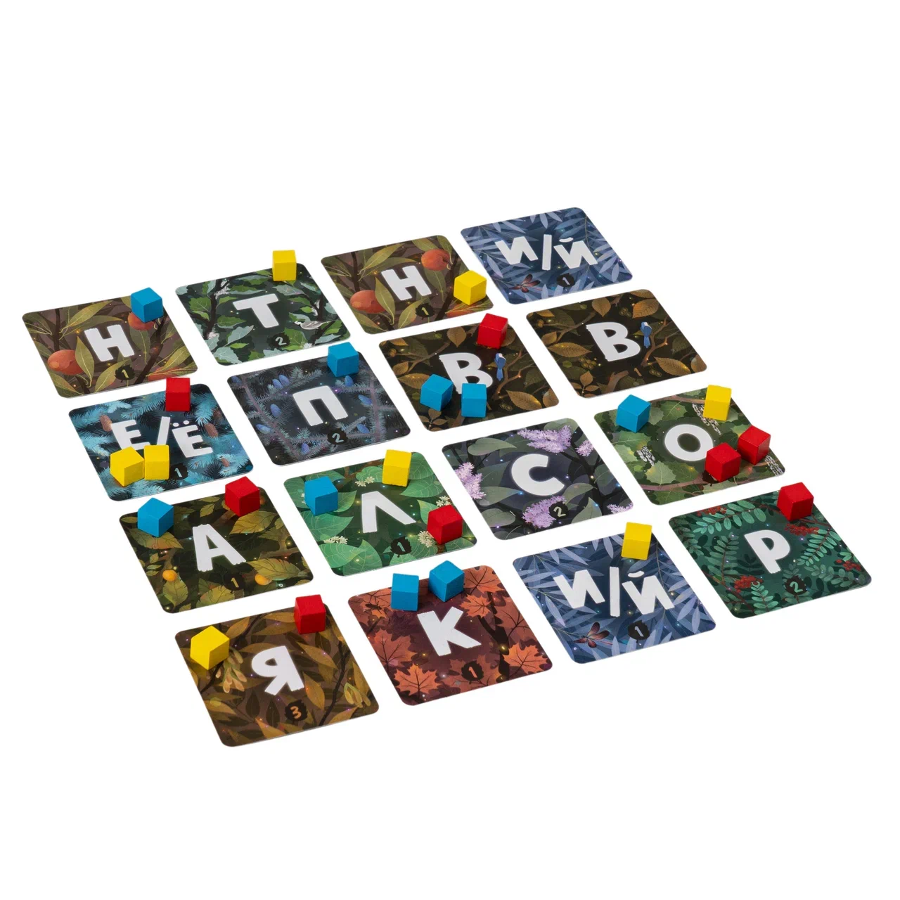 За одну минуту всем игрокам нужно составить слово из букв, лежащих на поле. Да так, чтобы все условия были выполнены и букв хватило! Получилось? Теперь игроки по очереди выставляют свои кубики на карты с буквами, которые использовали в своих словах. И так раунд за раундом: ищем слова — выставляем кубики.