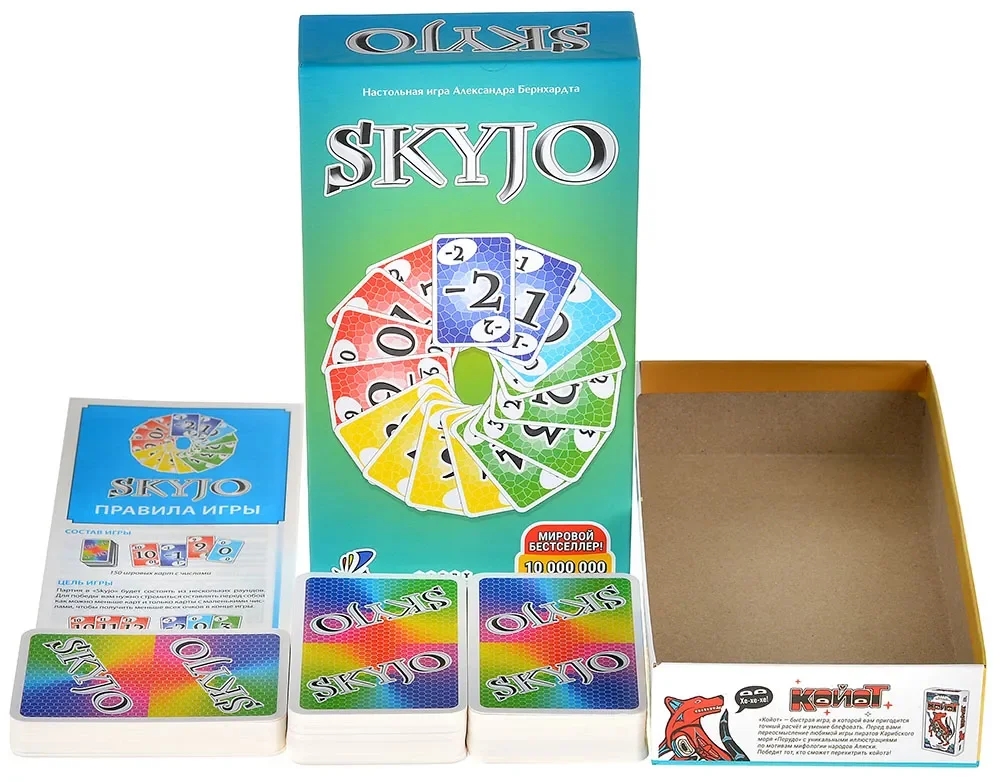 Ищете игру для уютных семейных вечеров или весёлых встреч с друзьями? Представьте мягкий свет, разговоры за столом и стопку карт, которая притягивает всеобщее внимание! В Skyjo каждый ход сопровождается лёгким волнением: какую карту открыть, рискнуть или сыграть наверняка... Эта игра наполняет вечер азартом, и с каждой новой партией кажется, что время летит быстрее!