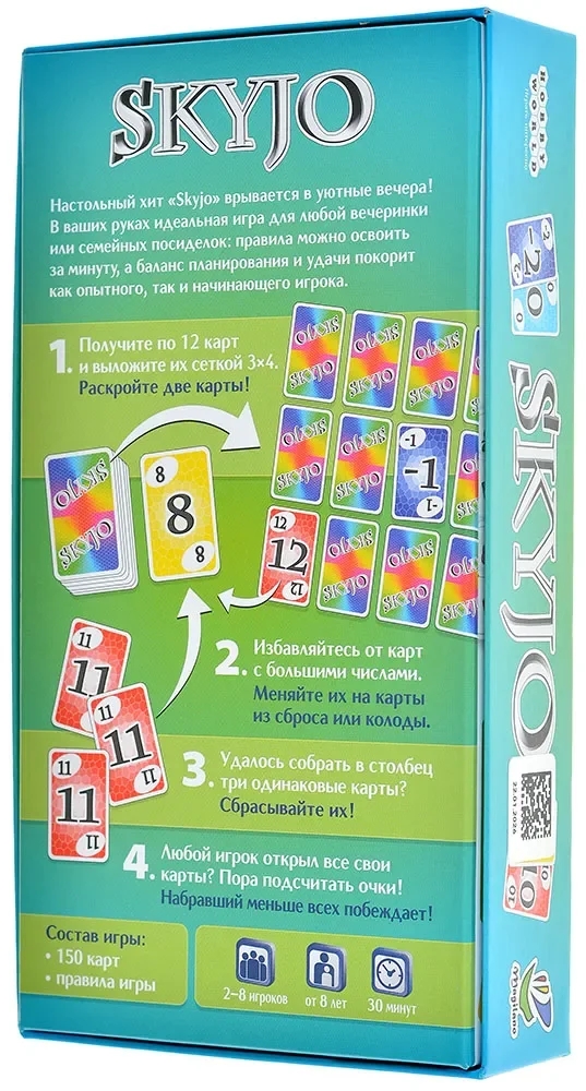 Skyjo – динамичная настольная карточная игра с простыми правилами, которые осваиваются буквально за минуту. При этом в игре удачно сочетаются расчёт и элемент удачи, поэтому она одинаково увлекает и тех, кто только знакомится с настолками, и более опытных игроков.