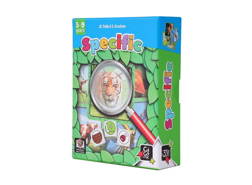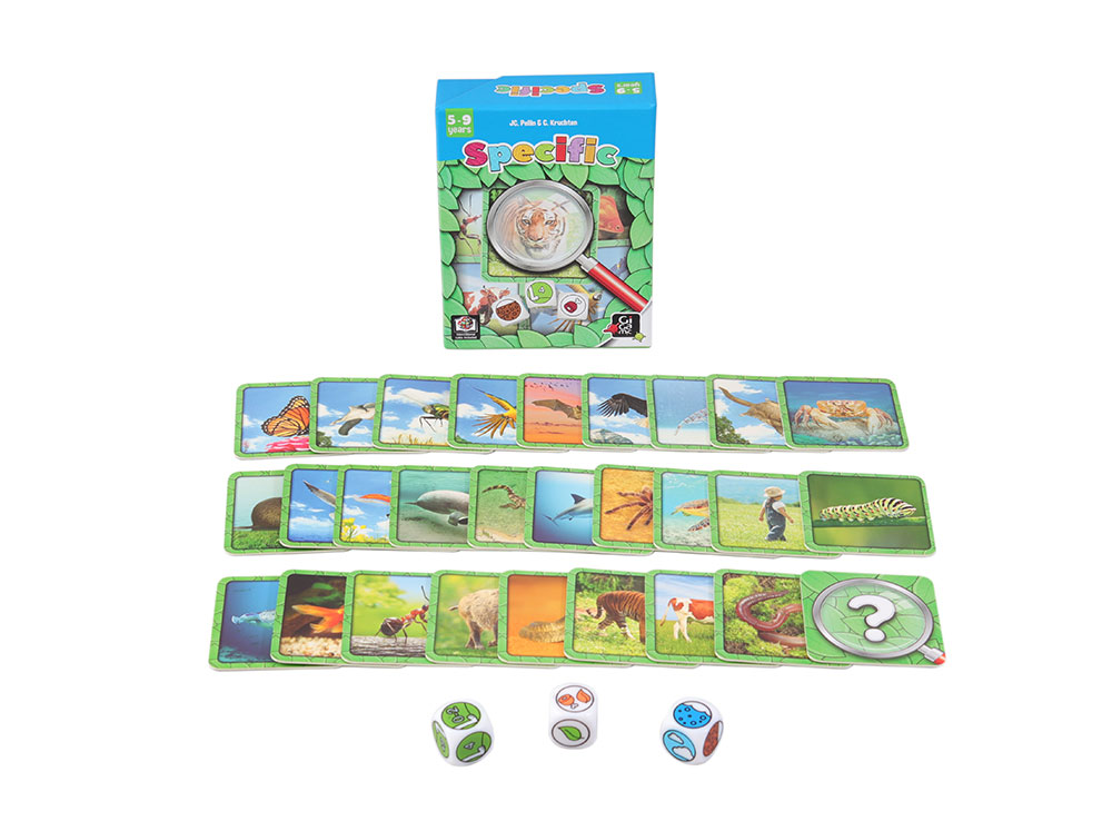 В состав настольной игры Следопыт (Specific) входят: 27 карт животных, специальная карта «?», кубик «число ног», кубик «среда обитания», кубик «питание», правила игры на русском языке.