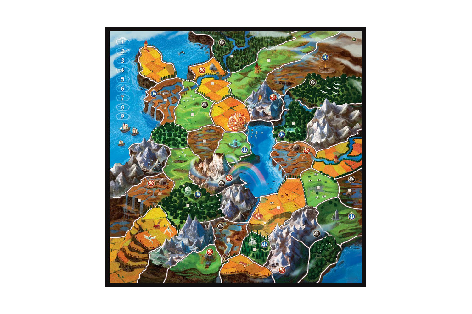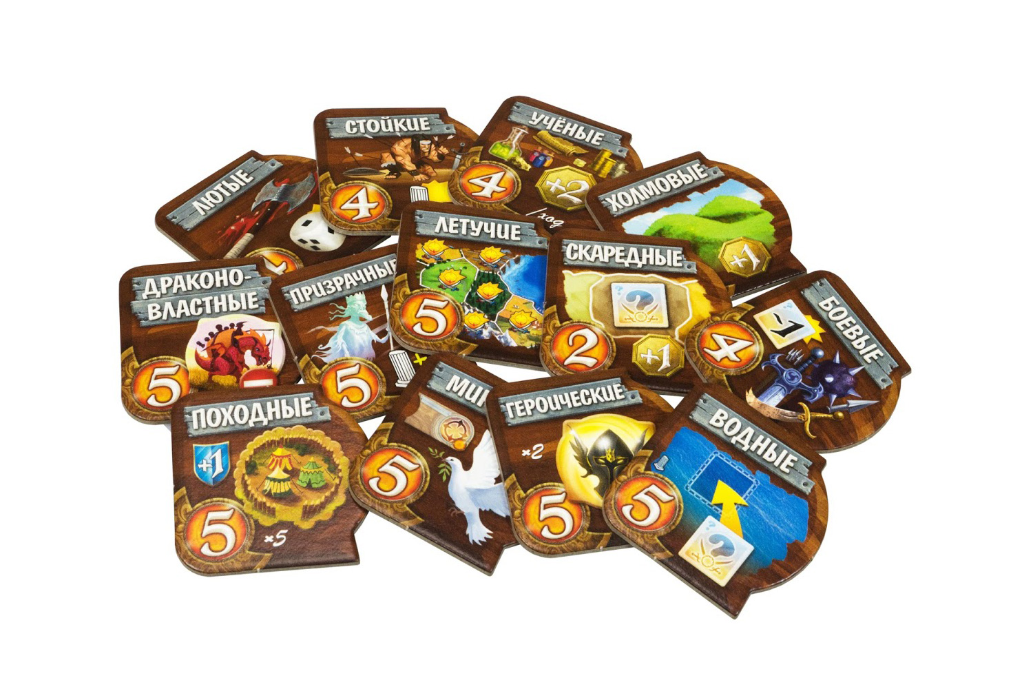 - 18 жетонов забытых племён, 10 тролльих пещер, 6 крепостей, 9 гор, 5 лагерей, 2 норы, 2 героя и 1 дракон;