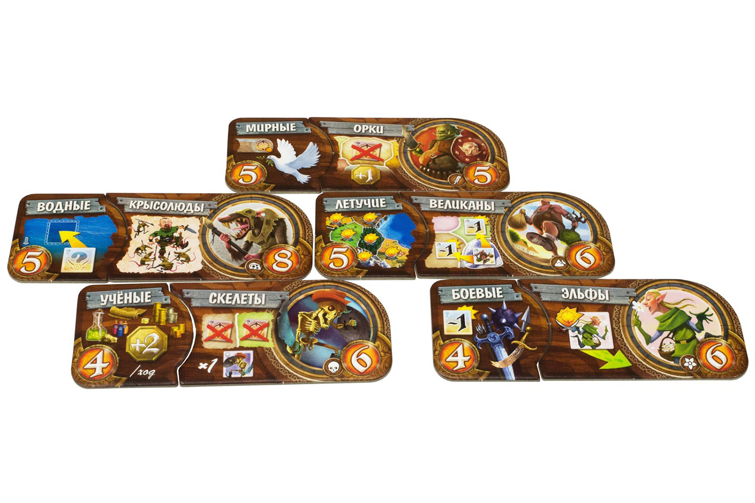 В начале игры на стол случайным образом выкладываются пять стартовых рас. У каждой расы есть своё уникальное свойство: к примеру, гномы получают больше очков за территории с рудниками, тритонам проще захватывать прибрежные земли, а тролли умеют строить логова. Кроме того, каждая раса получает дополнительное случайное свойство. Эльфы-мародёры, орки-дипломаты и даже летающие крестьяне с вилами – в маленьком мире возможно всё!