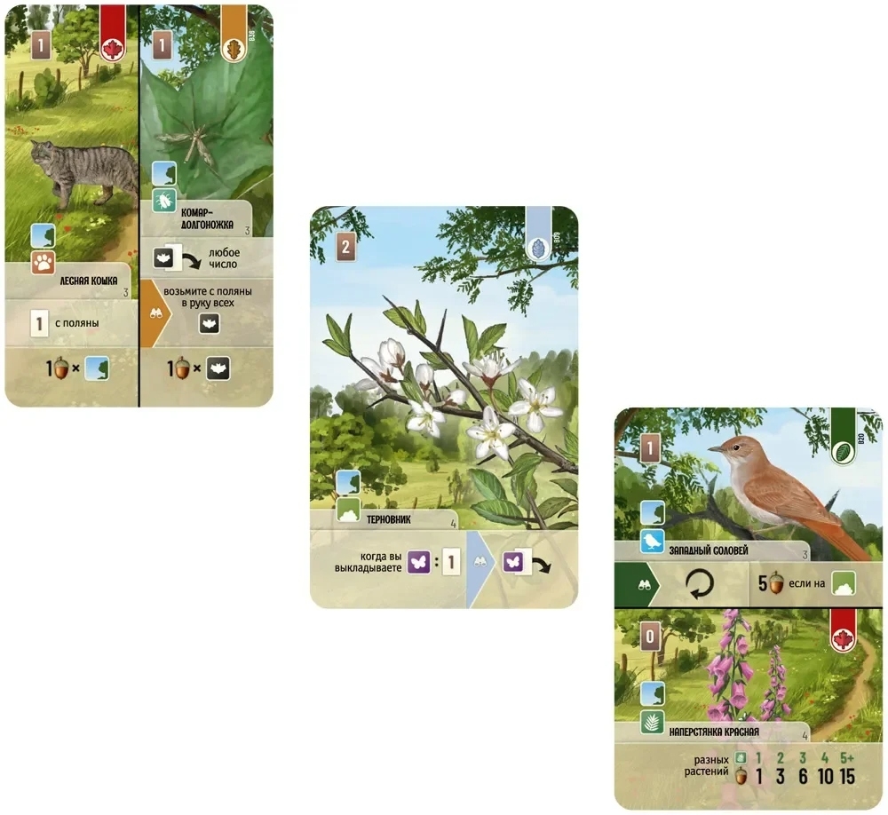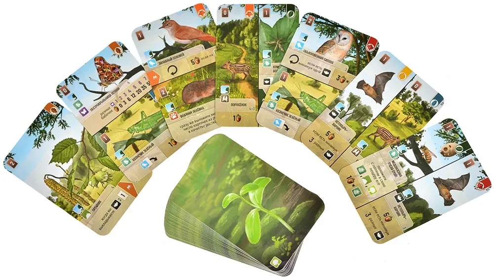 Деревья формируют основу вашего леса – их размещение позволяет заселять обитателей и пополняет поляну новой картой. Обитателей размещайте на свободных местах вокруг деревьев, аккуратно подставляя нужную половину карточки. Каждое удачное размещение приносит очки: животные ценят правильных соседей, растения – определённые деревья, а коллекции грибов и бабочек увеличивают ваш счёт.