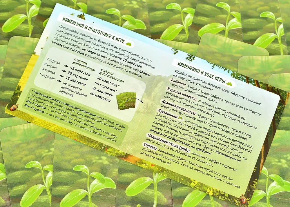 Дополнение "На опушке" расширяет границы вашего леса, добавляя новые тактические возможности и глубину взаимодействия. Добавился новый тип растений – кустарники. Также теперь больше насекомых: целых 4 новых вида! Эти маленькие обитатели леса привносят в игру динамику: насекомые часто требуют особых условий. Помимо прочего, в дополнение добавлены новые растения и животные, которые открывают свежие стратегии! Теперь у вас появится ещё больше (порой рискованных!) вариантов ходов.