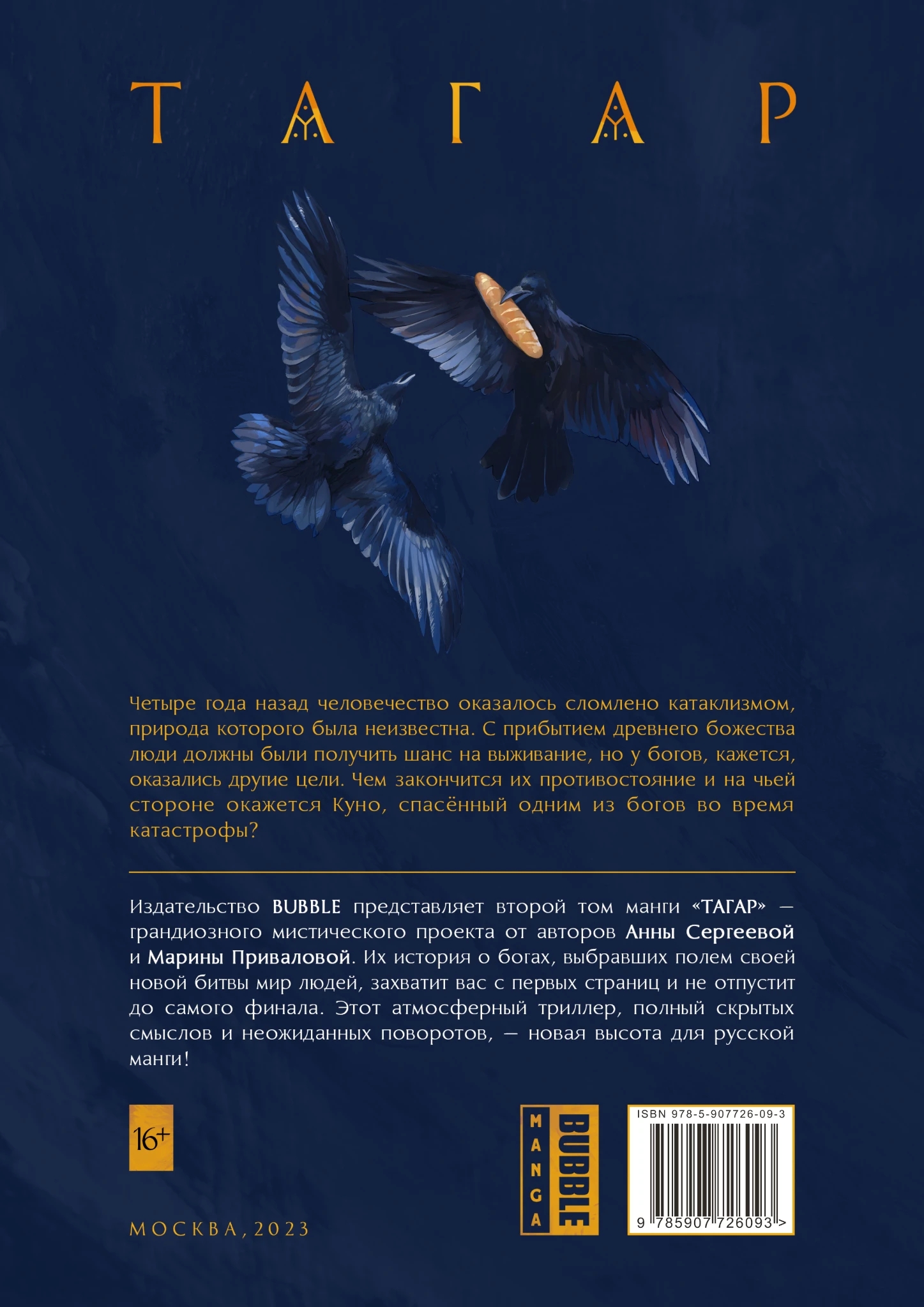 Четыре года назад человечество оказалось сломлено катаклизмом, природа которого была неизвестна. С прибытием древнего божества люди должны были получить шанс на выживание, но у богов, кажется, оказались другие цели. Чем закончится их противостояние и на чьей стороне окажется Куно, спасённый одним из богов во время катастрофы? Издательство BUBBLE представляет второй том манги "Тагар" — грандиозного мистического проекта авторов Анны Сергеевой и Марины Приваловой. Их история о богах, выбравших полем своей новой битвы мир людей, захватит вас с первых страниц и не отпустит до самого финала. Этот атмосферный триллер, полный скрытых смыслов и неожиданных поворотов, - новая высота для русской манги!