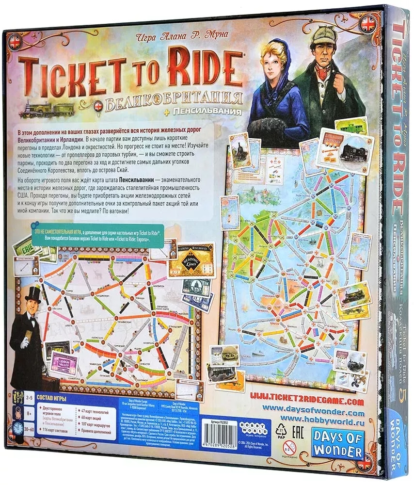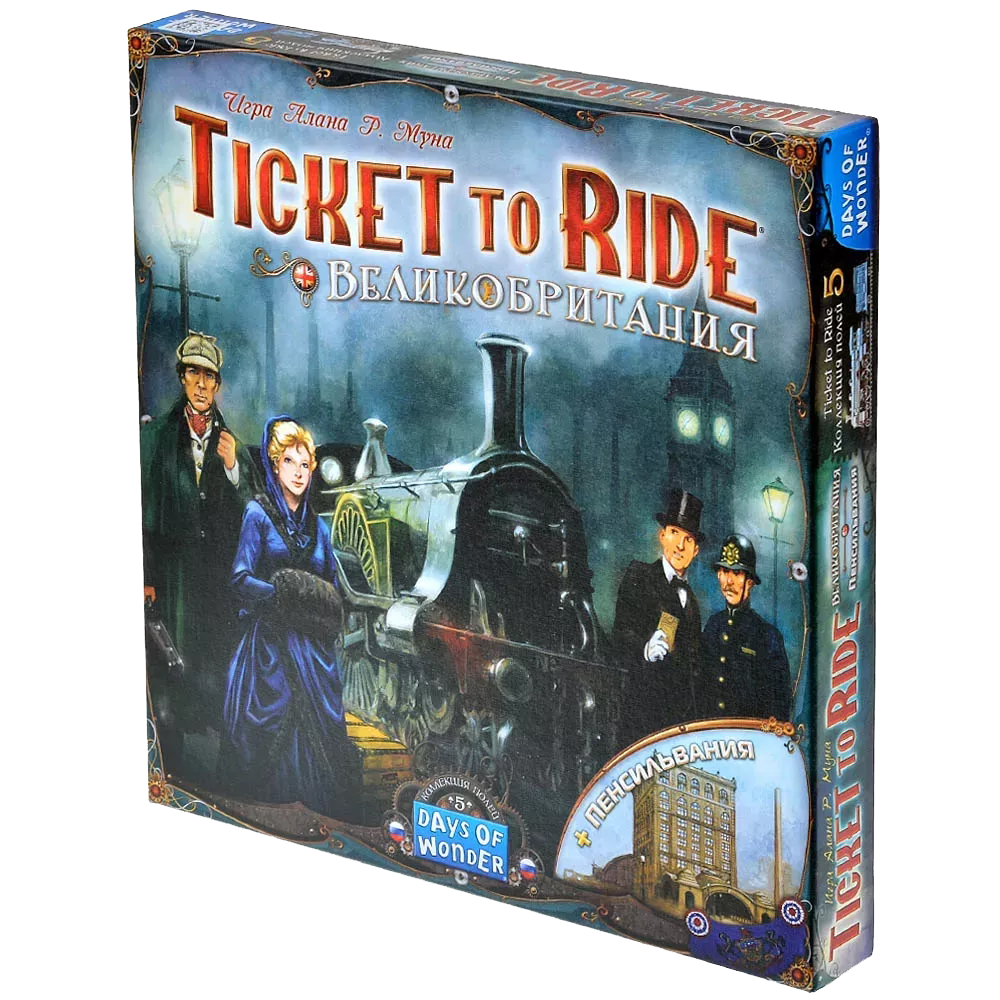 Дополнение "Ticket to Ride: Великобритания и Пенсильвания" откроет вам новые места для посещения. Вы сможете побывать в Туманном Альбионе, от столичного Лондона до самых удалённых уголков Соединённого Королевства и северных островов, проехав через всю Великобританию, – после того, как изучите новые технологии и улучшите свои поезда, конечно же.
