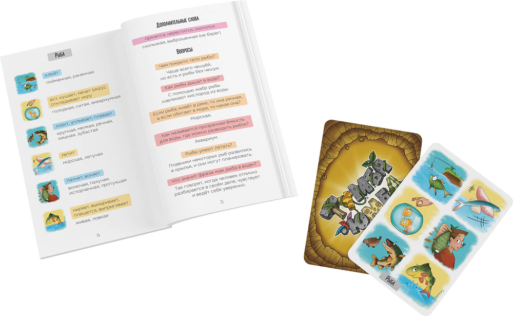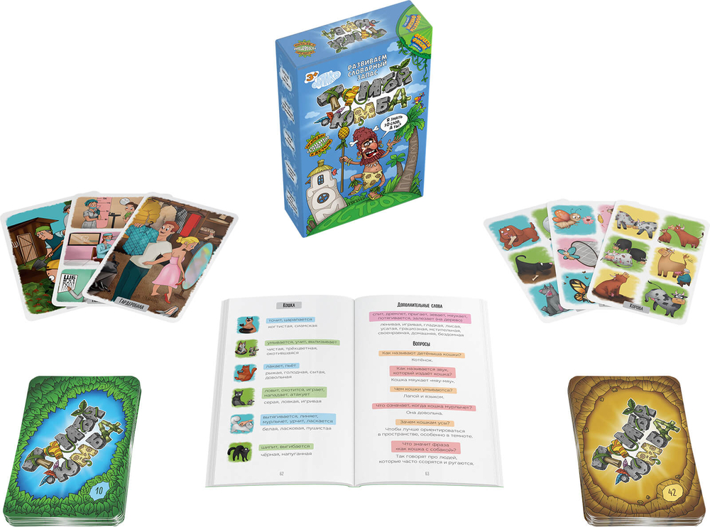 Карты с сине-зелёной рубашкой посвящены существительным, а с коричневой – глаголам и признакам. В буклете вы найдёте подсказки к карточкам, так что играть с ребёнком будет легко и весело! А ещё ребёнок узнает интересные факты и познакомится с популярными фразеологизмами.