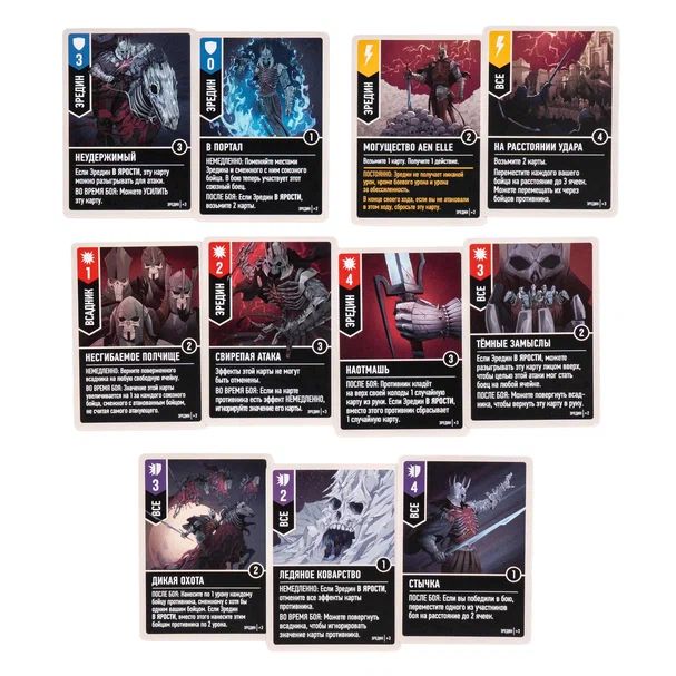 Эредин — безжалостный Король Дикой Охоты. Он сражается в ближнем бою в окружении своих верных помощников — Красных Всадников. А если 14 очков здоровья и 2 ячейки перемещения покажутся вам не самыми королевскими характеристиками, то его гнев вас точно впечатлит. Эредин впадает в ярость, если Красные Всадники повержены. Тогда он дальше перемещается, больнее бьёт, а некоторые карты усиливаются или получают дополнительный эффект.
