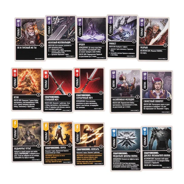 Геральт — опытный ведьмак и к каждой битве готовится по-особенному. Перед началом партии вы будете выбирать карты снаряжения: доспехи, меч и эликсир. От этого зависит ваша тактика боя и успех в конкретном поединке. В колоде Белого Волка найдётся и много знакомых по играм «фишек». Используйте его фехтовальные навыки, магические знаки и ведьмачье чутьё, ловко подстраиваясь под стиль соперника.