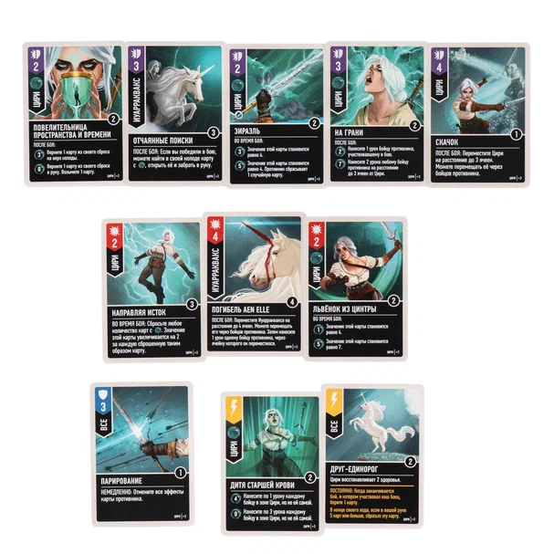 В бою ведьмачку сопровождает верный друг и помощник — волшебный единорог Иуарраквакс. Страшитесь его рога и её неудержимой силы! Ведь когда в сбросе Цири окажется 7 карт Истока, эффекты на разыгранных ею картах невозможно будет отменить. Колода и боевой стиль этого персонажа действительно впечатляют, но сможете ли вы справиться с такой необузданной мощью?