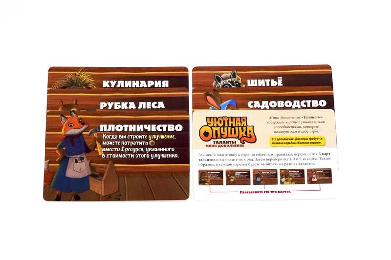 Мини-дополнение «Таланты» содержит карты с уникальными способностями, которые помогут вам в ходе игры. Закончив подготовку к игре по обычным правилам, вы выберете себе по 1 из 5 карт талантов, вышедших на партию.