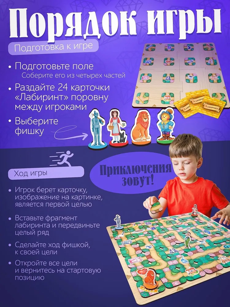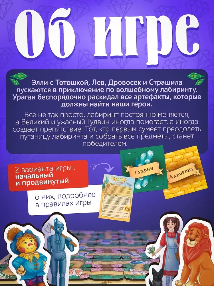 Вы держите в руках настольную игру, вдохновленную знаменитой сказкой Александра Волкова. Вам предстоит играть за одного из главных героев, которые отправятся в увлекательное путешествие на поиски Великого и ужасного Гудвина по лабиринту, полному опасностей и приключений.