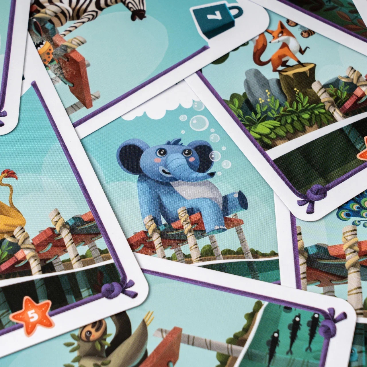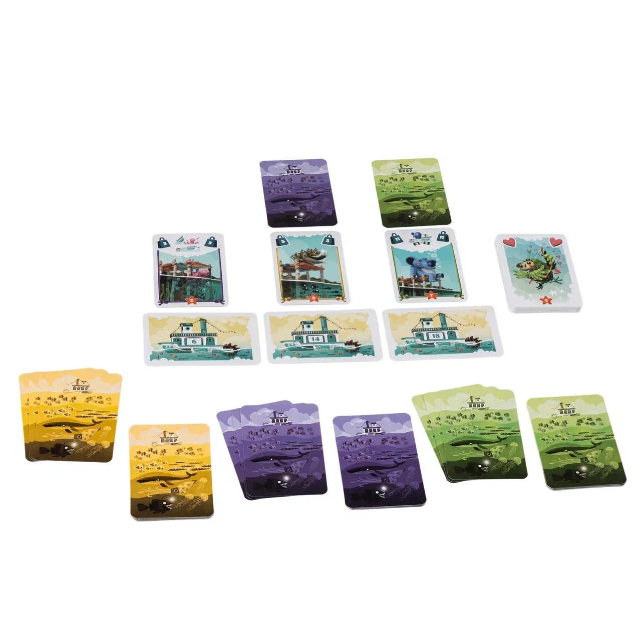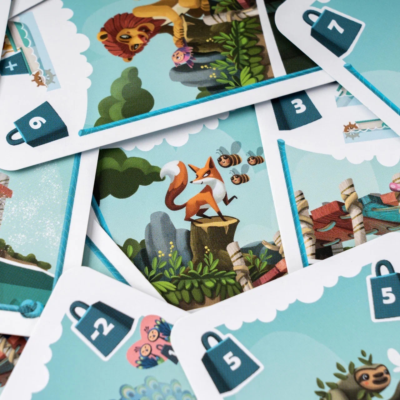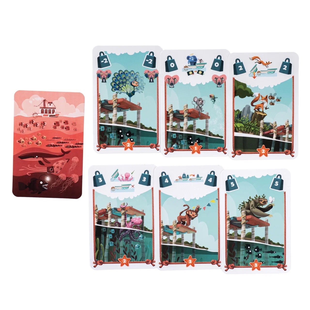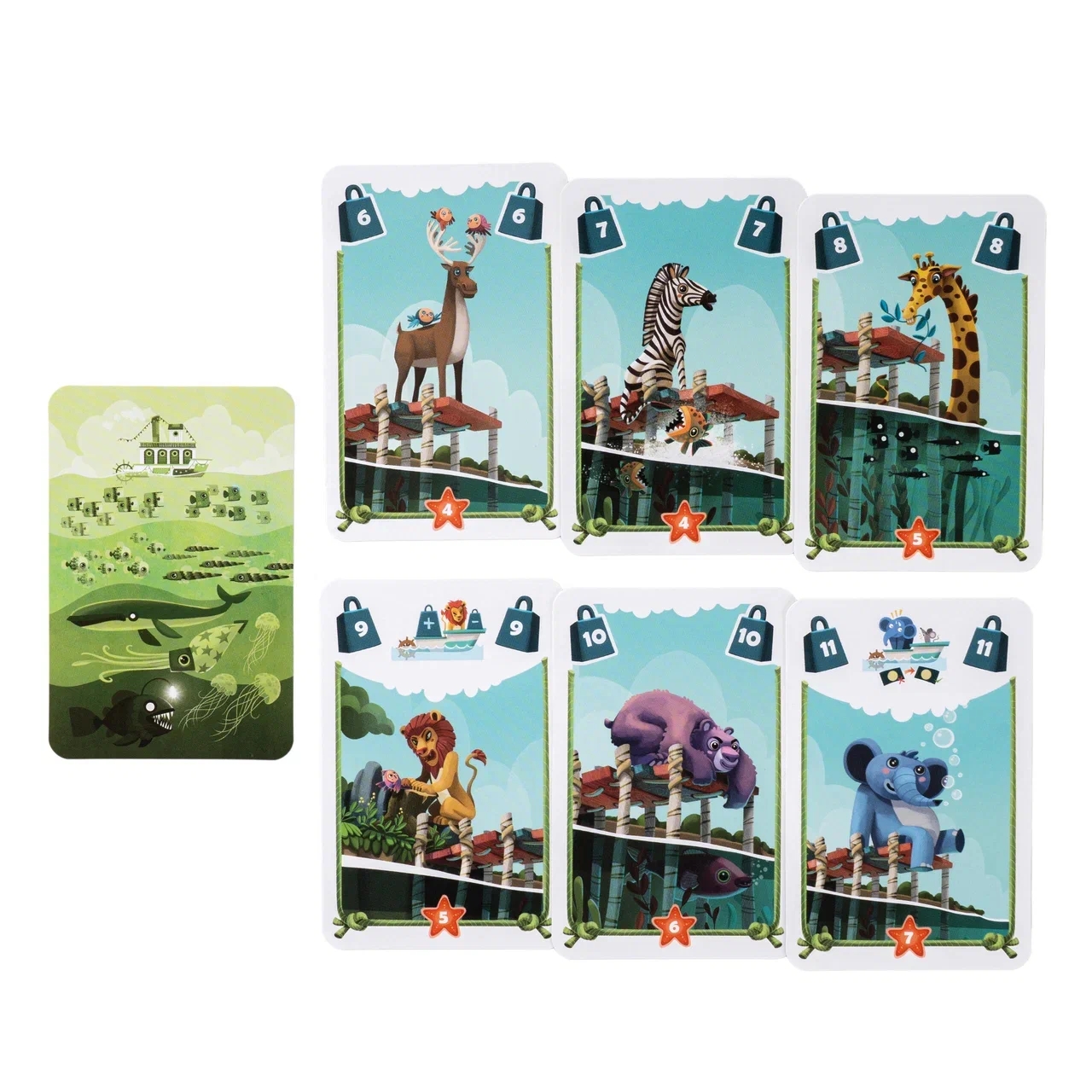 Для игры вам понадобятся только карты. У каждого игрока есть набор из 12 животных. У всех указаны вес и количество победных очков, которые они принесут, если смогут уплыть. А у некоторых есть особое действие (его можно игнорировать, если вы играете с маленькими детьми).