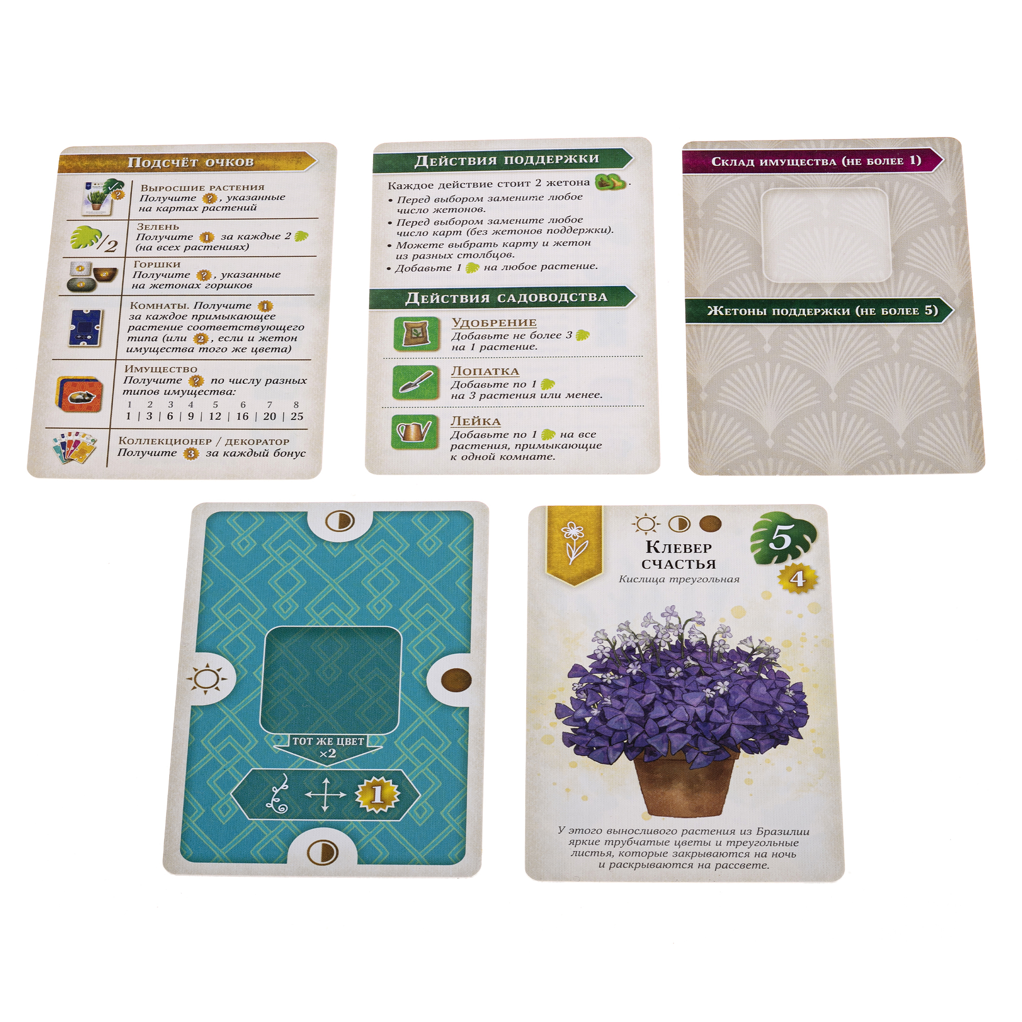 Каждый раунд вы будете выбирать набор из жетона и карты. Располагая комнаты и цветы в шахматном порядке, вам нужно будет учитывать и цвет комнат, и количество света, необходимое для различных растений. А также не забывать поливать и удобрять цветы, чтобы они росли быстрее! Ведь чем больше зелени будет в вашей уютной квартире, тем больше победных очков вы получите в конце партии.