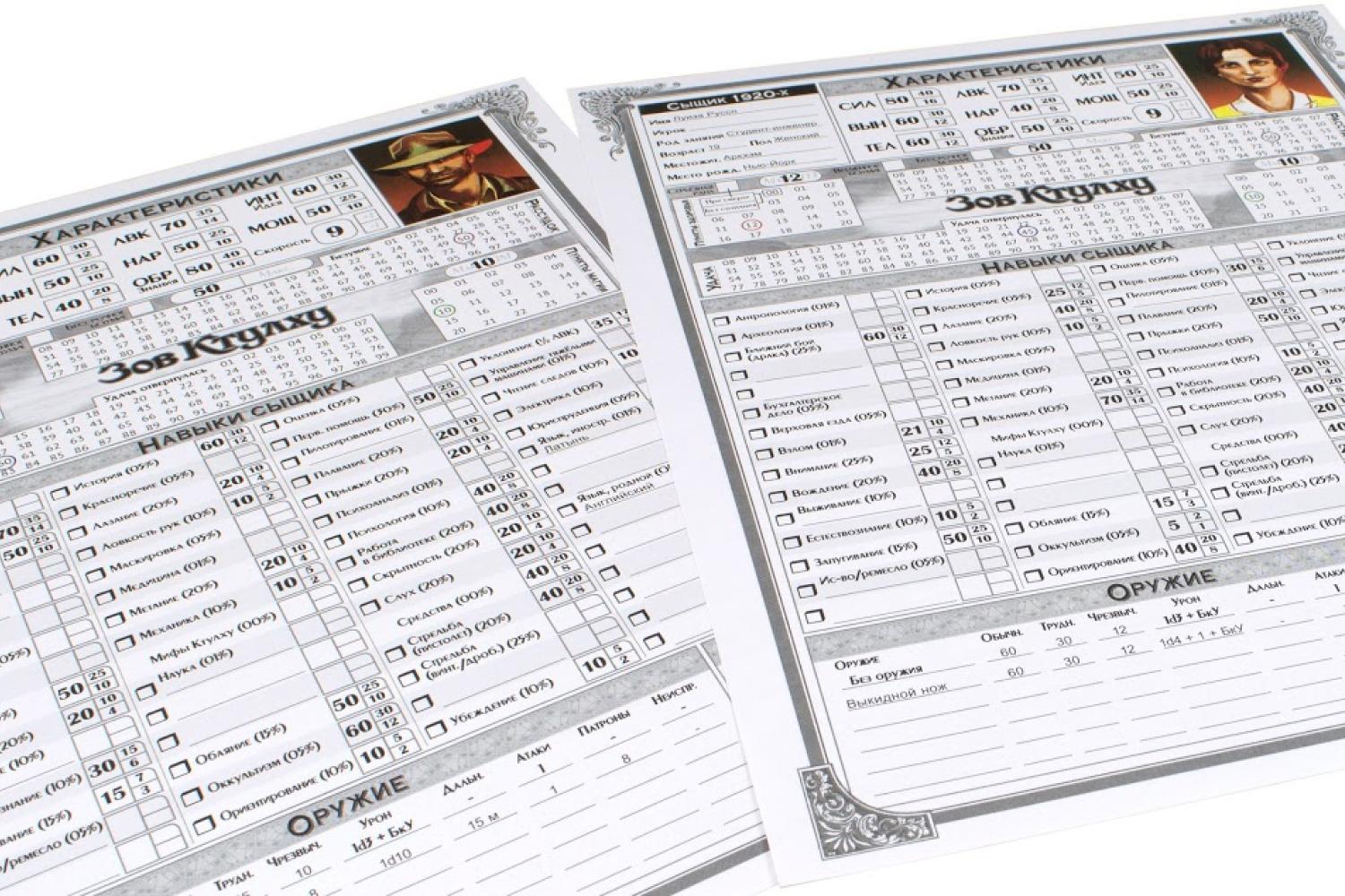 - Листы готовых сыщиков — пять готовых для игры персонажей.