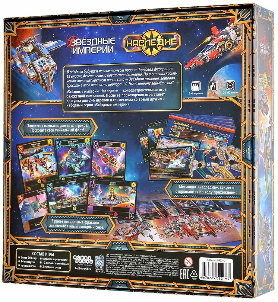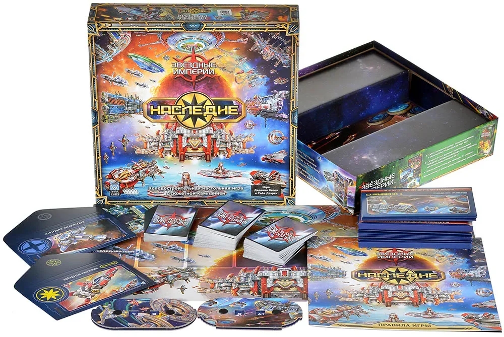 "Звёздные империи. Наследие" – это колодостроительная космическая стратегия с полноценной сюжетной кампанией, где каждый сценарий открывает новые карты, фракции и правила. Игра создана на основе серии "Звёздные империи", поэтому поклонники быстрее вольются в процесс, а новички смогут легко освоиться. По мере прохождения вы будете улучшать корабли и базы, влиять на торговую колоду, получать новые сценарные цели и усиливать влияние своей стороны. После завершения кампании набор превратится в полноценную игру для 2-6 человек, а ещё его можно будет сочетать с другими коробками серии!