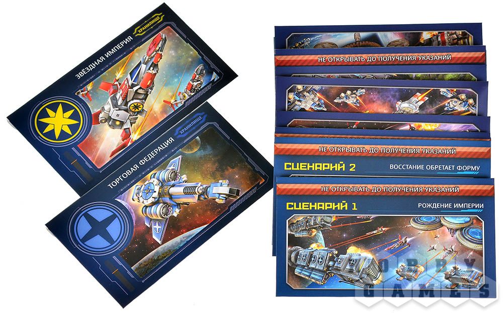 В начале кампании вы выбираете сторону – Звёздную империю или Торговую федерацию – и получаете личную стартовую колоду. Каждый сценарий открывает новый конверт с компонентами.