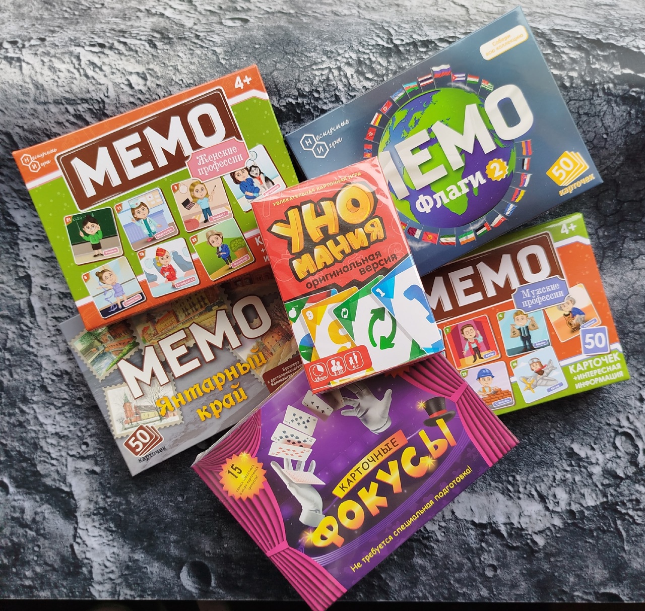 Каждая игра Мемо состоит из 50 красочных парных карточек. Цель игры – собрать как можно больше пар карточек с одинаковыми изображениями. Начинает игру самый младший игрок и ход переходит по часовой стрелке. Игроки по очереди открывают по две карточки, если они совпадают, то игрок забирает их себе и получает право на следующий ход. Если картинки на карточках не совпадают, они возвращаются на свое место в колоде, а ход переходит к следующему игроку, сидящему слева. Выигрывает тот, кто соберет больше всего пар карточек.
